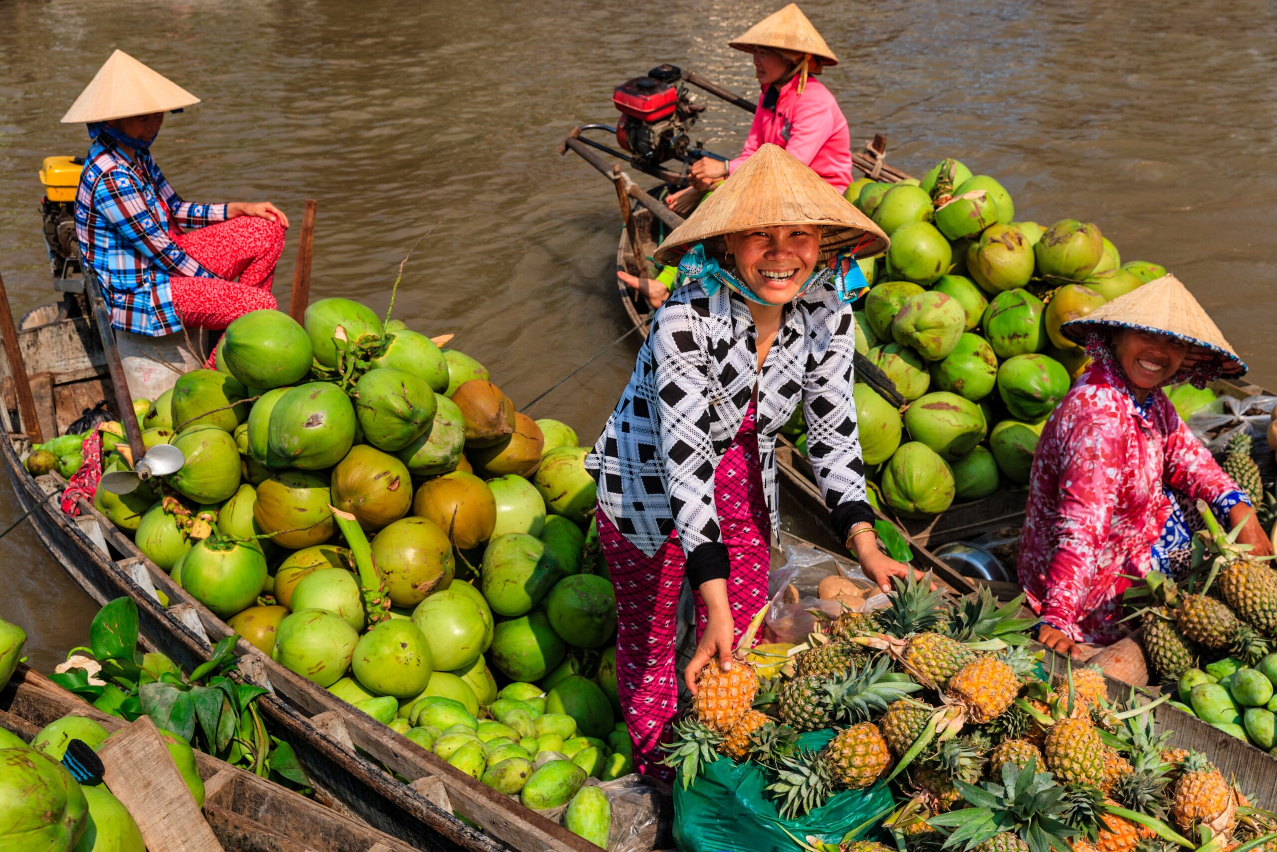 Local traders transferring goods between boats at Cai Rang floating market, Mekong Delta.